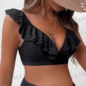 NEW SHEIN Swimsuit Top With Ruffle Trim Black Bikini TOP only XL (12)