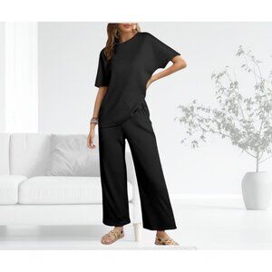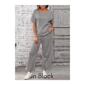NEW SHEWIN 2 PC Lounge Set - Casual Waffle Knit Short Sleeve Top/Wide Leg Pant