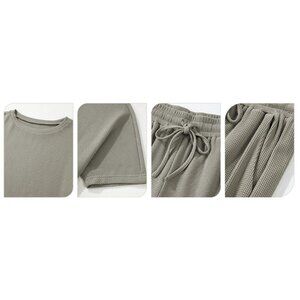 Feature: Two piece Oufits, Lounge Sets, Pajamas Set, Crewneck, Waffle knit, short sleeve pullover top, pants with elastic waist, two pockets, solid color, and oversized loose fitting. The elastic waistband on the pants provide a custom and secure fit, while the pockets on both sides offer convenient storage for small items.