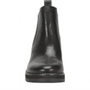 The Women's Emeree Wedge Boot by Sofft in black leather is a chic addition to any fall wardrobe. This minimalist Chelsea boot, part of the AQUA Söfft collection, is crafted from waterproof suede and leather with seam-sealed construction. It features a comfortable leather-lined footbed with arch support and an almond toe design. The 2.75-inch wedge heel is complemented by a non-slip TPR outsole providing excellent traction. Ideal for narrow widths, these boots are perfect for engagement occasions.
