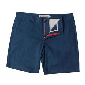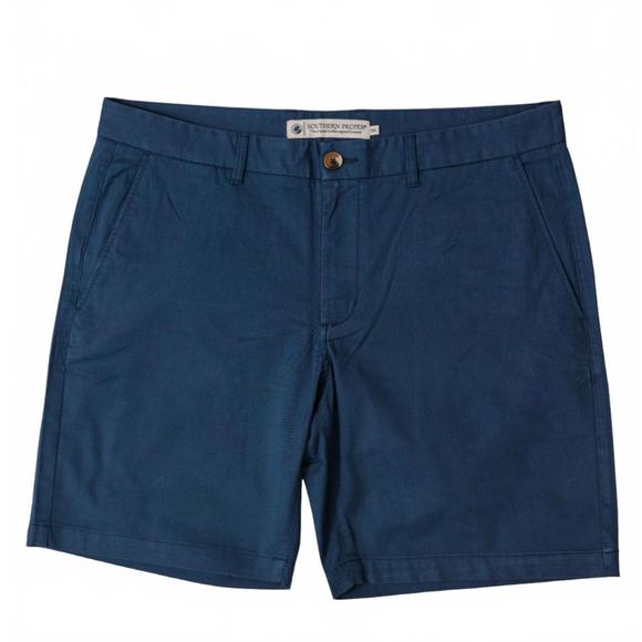 - Description: The Men's Bluff Shorts by Southern Proper offer the ultimate blend of style and comfort with their solid navy design. These shorts feature an 8" inseam, crafted from a cotton blend for added ease and flexibility. Closure is secured with a button, and they include button-through back pockets with a contrasting Dusty Cedar zip fly for a pop of color. Ideal for dressing up or down, these minimalist shorts are perfect for travel and Father’s Day. 98% Cotton 2% Spandex.