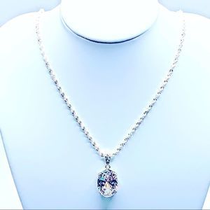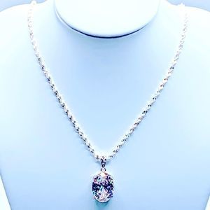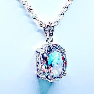 NEW! This absolutely lovely sparkling AUSTRIAN CRYSTAL pendant is set within a brightly polished 925 silver finish and features a large emerald cut oval white crystal. The chain is a gorgeous sparkling 925 silver wave chain with a 1.5 mm thickness. The chain length is 24” with a lobster claw clasp. Beautiful and elegant!