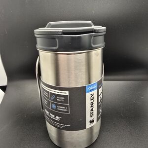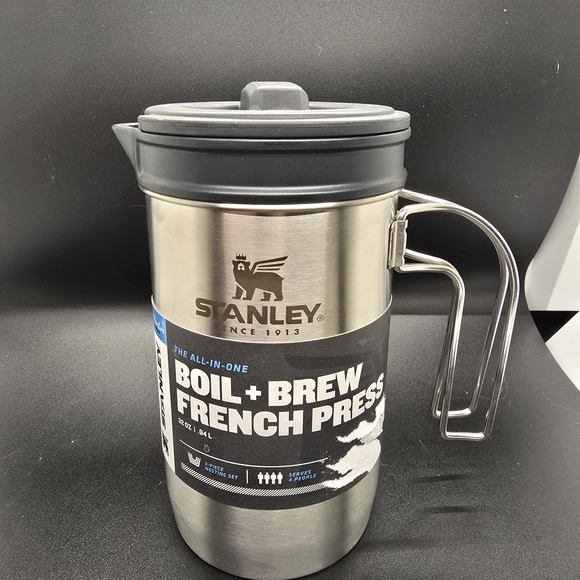 The NEW STANLEY All In One French Press Boil & Brew 32oz Stainless Steel is a versatile kitchen appliance perfect for coffee lovers. With its 1 qt capacity and removable filter basket, this French press is ideal for brewing your favorite beverages on the go. Made of durable stainless steel, it is lightweight, portable, and easy to clean, making it a convenient and practical gift for anyone who enjoys a good cup of coffee. The metallic silver finish adds a touch of style to this essential on the go stanley adventure product.