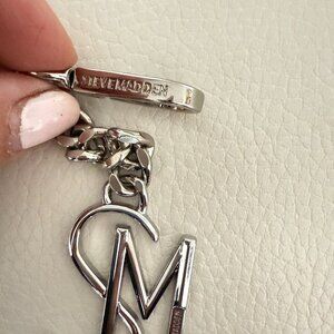 This listing is for a brand new Steve Madden silver tone logo key fob / charm for bag