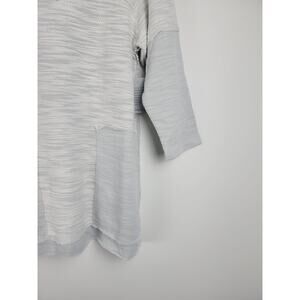 Canvas color (light gray and white. Hoodie. Non-functional gray patch pockets. Raw seams. Striped gray and white. Adjustable neck ties. Long sleeves. Raw hem. 52% Cotton, 48% Polyester. Nice oversized look, good amount of stretch. Super sharp!