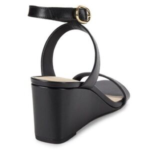 A buckle closure wraps around the ankle of this contemporary wedge sandal crafted from leather.