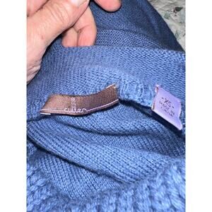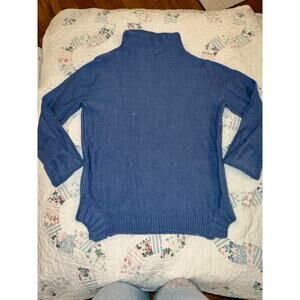 NEW UNWORN SILKY SOFT SWEATER IN A BEAUTIFUL SHADE OF BLUE. UNIQUE TURTLENECK WITH NO ROLL! CABLED DOWN FRONT. COTTON WOOL NYLON BLEND IS SILKY SOFT. MEASUREMENTS IN PHOTOS