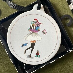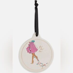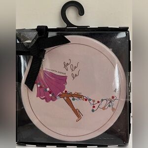 Brand new. Saks Fifth Avenue Print Ornament. Available in pink (fa la la string lights) or white (presents) (see photos).