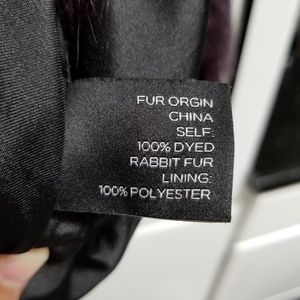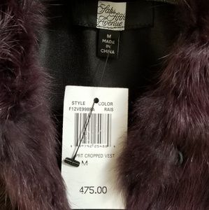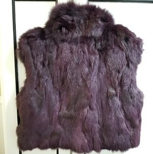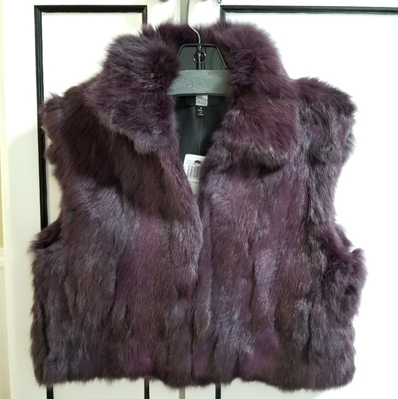 Brand new with tags Saks Fifth Avenue 100% rabbit fur cropped vest in an amazing raisin color purple. Size Medium. Black inside, foldable collar, and 2 front hook closures (see picture). Doing some closet cleaning and thought someone else should give this some love since I haven't been able to.