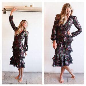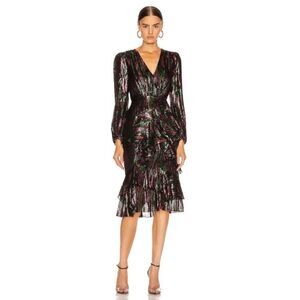 NEW Saloni Alya Black Rainbow Oilspill Silk Metallic Midi Dress Size 4