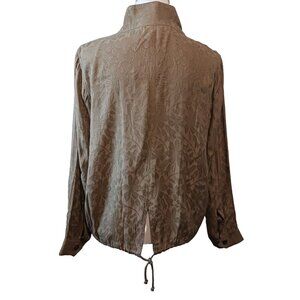 Discover the Saltwater Luxe olive floral embossed jacket in size M. Crafted from subtle shimmery fabric, featuring a full zipper and snap front closure as well as a drawstring hem with tie on back to style as you wish. Perfect lightweight jacket with a satin feel lining.