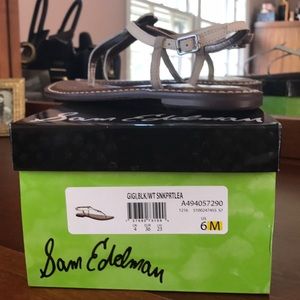 Sam Edelman NEVER WORN Gigi T-strap Sandals in B&W Snake Print Leather π Animal Print is all the rage for Fall '17 #TrendAlert. Super Cute shoe for a transition to fall sandal. Comes with shoebox