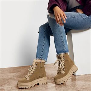 Cozy meets cool with this shearling-detail combat boot. Snuggle into this suede lug-sole style that complements fall's chunky sweaters.