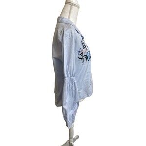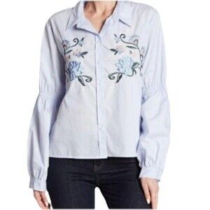 Santuary women's size small light blue button down long sleeve shirt with beautiful floral embroidery on front. Material is 100% cotton. Brand new no original tags- only boutique tag but the baggie with extra buttons is still attached. Stored in a smoke-free environment.