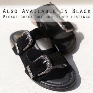 This must have sand slide sandals were born to be wild! A western-inspired, engraved gunmetal silver buckle and adjustable vegan suede straps on these stylish slides. Comfy cushion footbed with stacked wooden heels. Easy slides slip on design. If you have wide feet, no worries straps can be adjustable. Perfect festival ready or everyday sandals! Super versatile. Throw these on with denim jeans or shorts and funky sunnies for a super cool summer vibe. You're sure to look amazing! Festival Coachella Rodeo Casual Everyday Boho Bohemian Style