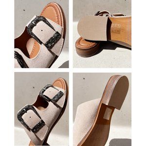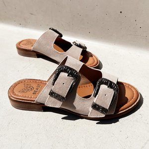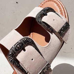 NEW Sand Faux Suede Western Metal Buckled Straps Slides Slip On Sandals Shoes