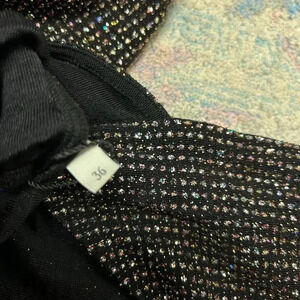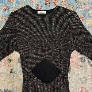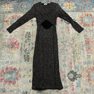 Long-sleeve bodycon dress with cutout in the front and shoulder padding.. Embellished/glitter fabric. Midi length. Smoke free home.