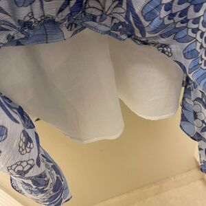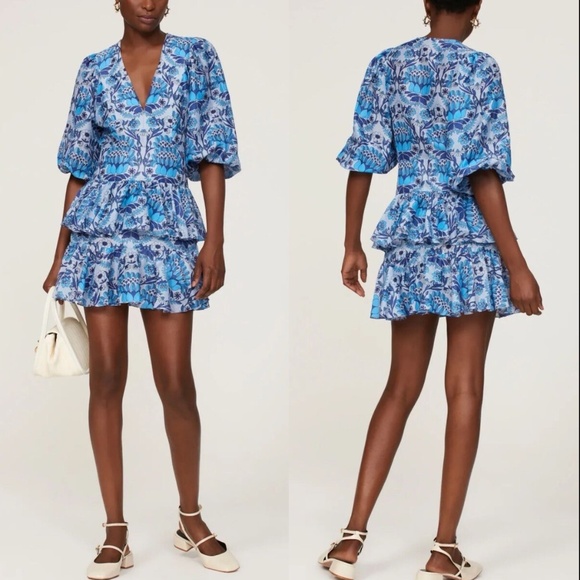 NEW WITH TAGS. Sandro linen blend mini dress with v neck and tiered ruffle skirt in pretty blue print - size 36 (or small). Please see photos for design, condition and measurement details. SMOKE AND PET FREE HOME. Please contact me with any questions. Thank you. ***NOTE: There is a very slight fraying of the fabric near the zipper area - not noticeable when wearing (see last photo close-up).*** About the brand: Parisian pieces through and through. Linen-Blend Mini Dress in blue with V-neck, puff sleeves, elastic cuffs and tiered ruffle skirt Please note: Size selections are European. For US conversions, please reference the size chart. Approximately 33in from shoulder to hem Left side seam zipper closure 54% linen, 46% viscose Lining: 100% cotton Hand wash Imported