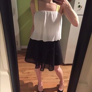 Lined full mesh skirt with contrasting color block plisse pleated white top and adjusted pastel yellow straps. Labeled SIZE FR 3 fits a US 6-10.