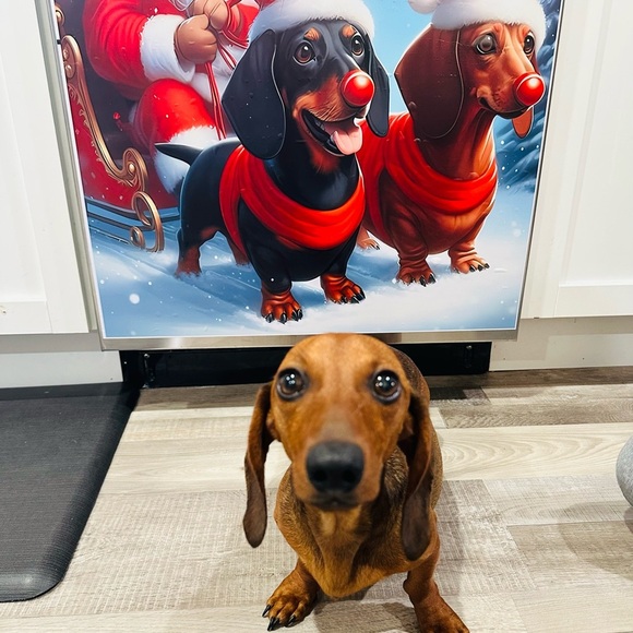 Festive dishwasher cover featuring Santa and Dachshunds. Perfect for Christmas decor. Vibrant red and white colors.