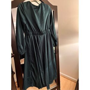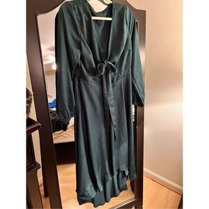NEW Satin Deep V Neck Dress Tie Front High Waist Flowy Ruffle Midi Cocktail L