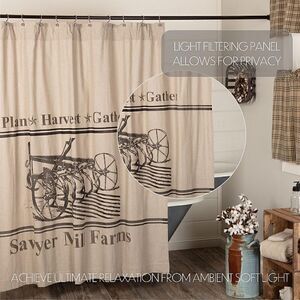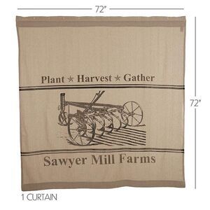 NEW!Add simple, rustic charm to your farmhouse bathroom with our 100% Cotton Sawyer Mill Plow Shower Curtain. These fall shower curtains are covered in a natural tan and proudly showcase a distressed stenciled farm plow surrounded by the words, "Plant, Harvest, Gather", separated by country stars. Grain sack stripes and weathered tones give this shower curtain a vintage look, perfect for your farmhouse style decor. A generously sized rod pocket and button holes on top make it easy to hang with a curtain rod or shower hooks of your choosing (not included). Measures 72x72 inches.