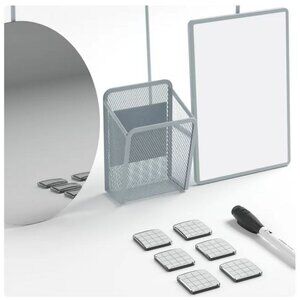 Includes (1) Shelf, (1) magnetic storage cup, (1) dry erase board, (1) magnetic mirror, (6) magnets and (1) dry erase marker