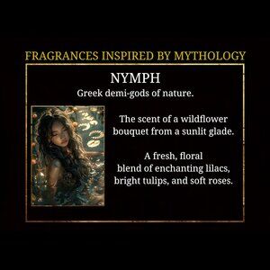 “Nymph” fragrance was inspired by the nature demi-gods of Greek mythology. A floral bouquet that includes lilacs, tulip, and rose. A very pleasant, feminine scent that's not too heavy.