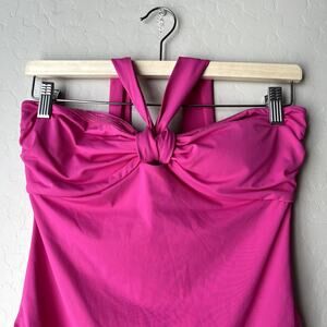 Seafolly hot pink halter bandeau one-piece swimsuit. With a twist front design at bust. Soft cups for a smooth bust shape. Side boning to add structure & support. Gripper tape along neckline to secure. Modest legline. Hot pink. Size U.S. 10.