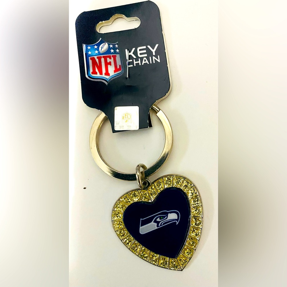 Heart-shaped keychain with Seattle Seahawks logo. Features gold accents.