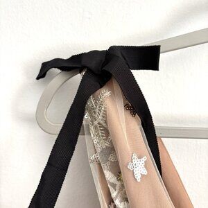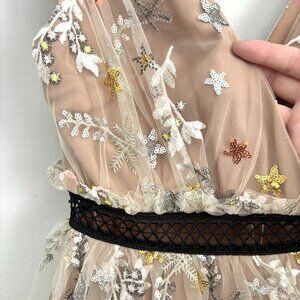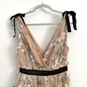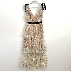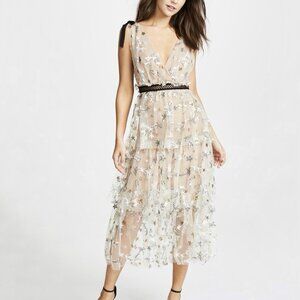 Brand New Self-Portrait Star Mesh Midi Dress, women’s size 4! Tulle material with embroidered flowers and sequined stars, black crocheted waist, side zip, partially lined, ribbon bows on straps.