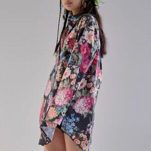 Slip into the cool cotton folds of this perfect oversized blouse. Crisp and comfortable, this blouse stands out with classic design details–a neat back pleat, wide cuffs, and a front patch pocket with a gleaming hardware detail. The Puck print, a nod to Shakespeare's impish fairy, adorns the blouse with a 90’s floral motif.