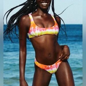 Super pretty pink orange yellow and white tie dye 90’s eco crop bikini top and matching bottoms.