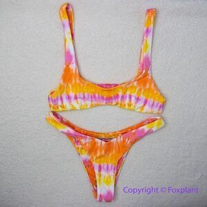 Super pretty pink orange yellow and white tie dye 90’s eco crop bikini top and matching bottoms.