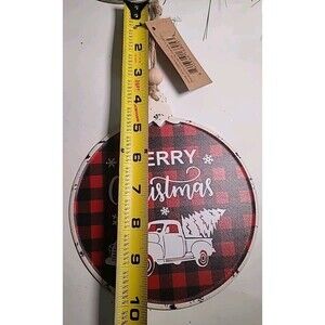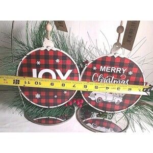 NEW Set Metal Buffalo Check 6.5" Merry Christmas & JOY Tree Ornaments Farmhouse
