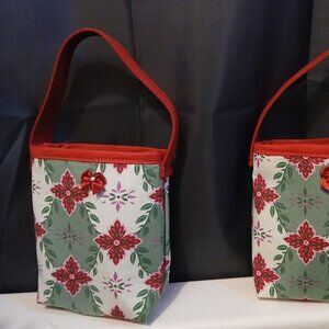 NEW Set of 2 Reusable Fabric Gift Bags Pointsetta Red Green w/ Ribbon Bow 6x6x2"