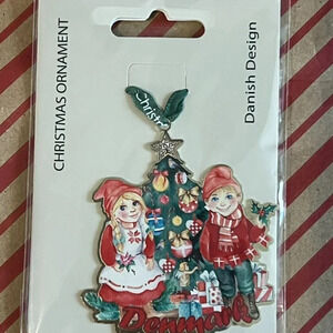 Old Fashion / Vintage Christmas themed ornaments from Denmark in gold tone metallic. This assortment includes classic icons like Santa Claus, Rudolph, Danish kids with gifts and Christmas Tree. Each ornament measures between 3" to 4" tall.