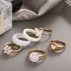 Set of 6 retro style rings, floral boho jewelry, smiley face ring, flower ring. Gold and white