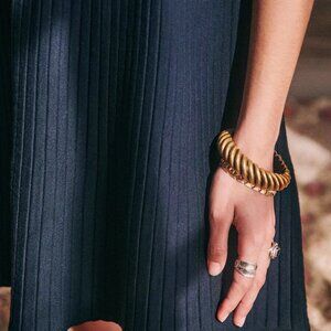 This stunning Sezane dress is perfect for a night out, featuring a ribbed texture in a striking blue hue. The fit and flare silhouette is complemented by a scoop neckline and cuffed short sleeves, offering a chic and sophisticated look. Ideal for cocktail occasions, this midi dress combines elegance with modern style.