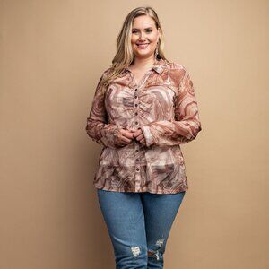 NEW Sheer Cream Mocha Swirl Button Down Ruched Long Sleeve Blouse Top PLUS SIZE