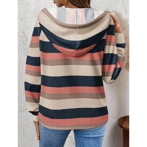 You will love the casual vibe of this Colorblock Striped Print Hooded Sweatshirt from Shein. It has a half placket button front, drawstring hood and a knitted fabric with slight stretch. With it’s multicolor printed stripes in brown, cream, pink and blue it is a great choice for fall.