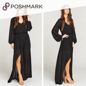 Look and feel gorgeous in Mumu's Jocelyn maxi dress that features a v-neck neckline and a sky high slit for added drama. Elastic waist and cuff. Overlapping skirt to create slit. Keyhole opening in back. Basically wrinkle proof. Unlined.