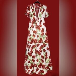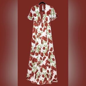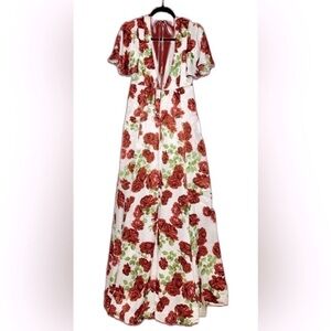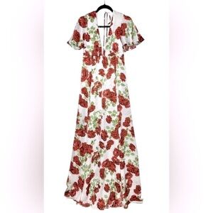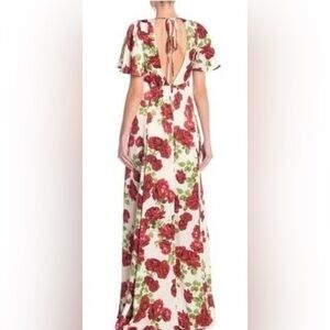 Brand NEW Show Me Your Mumu Faye Flutter Maxi Dress in Budding Rosemance. Features include: short flutter sleeves, low-cut v-neck, mini-length lining, flowy skirt with slits on both sides, open back with tie at back of neck, and hidden zipper with hook and eye closure. Romantic gown with gorgeous blooming roses.