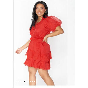 NEW with tags Show Me Your Mumu Red Chiffon Mini Dress. Elastic waist. V-Neck. Detachable belt. Lined. Short Puff Sleeve.