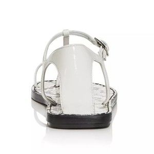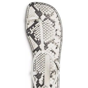 The Nelson flat thong sandal features a barely there white nappa upper. The unique square toe insole is covered in black and white multi snake embossed leather. Leather lining and outsole. Toe ring style thong ensures a secure fit. Ankle strap with heel protection.