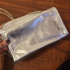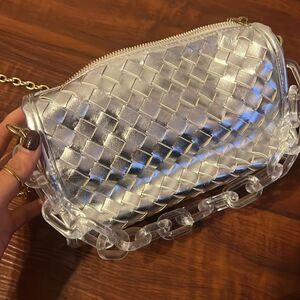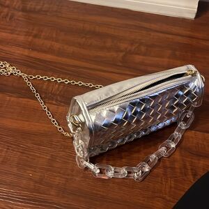 NEW Silver Crossbody Handbag Acrylic Top Handle Zipper Closure, Long Gold Strap