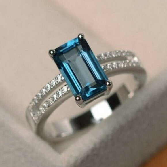 NEW Silver Emerald Cut Blue Topaz Diamond Ring