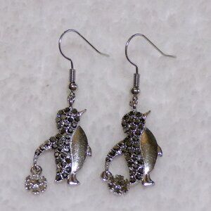 NEW Silver Penguin Dangle Earrings Black & Crystal Rhinestones