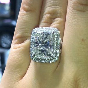 NEW Silver Radiant Cut Huge Diamond Halo Ring
