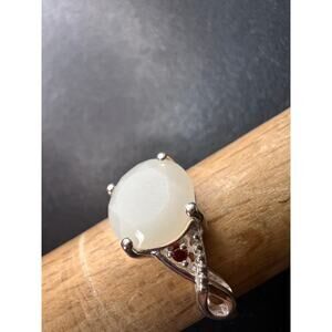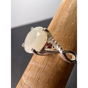 Silver moonstone from Sri Lanka with two red cubic zirconia accent stones. Set in sterling silver. Size 6. 925 . 2.35ctw